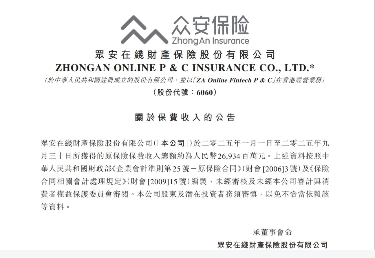 10月14日,众安在线发布保费收入公告。该公司于2025年1月1日至2025年9月30日所获得的原保险保费收入总额约为人民币269.34亿元,同比增加5.64%。